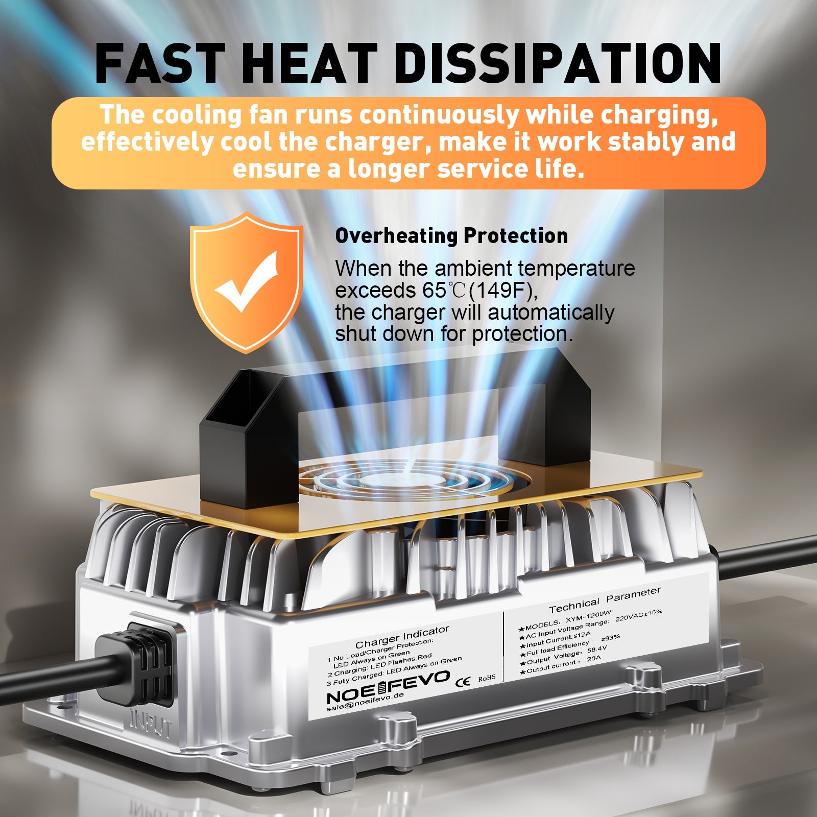 NOEIFEVO-laddaren har klarat stöt- och högtemperaturtester och stöder ett temperaturintervall på -18°C till 45°C för säker och pålitlig drift.